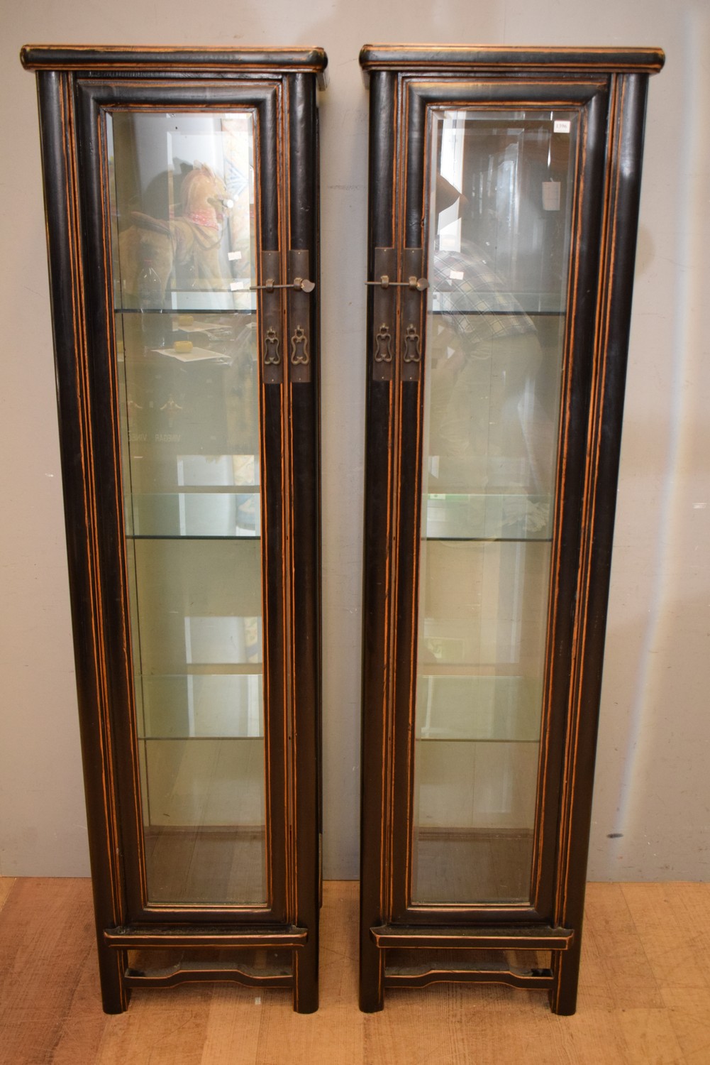 A PAIR OF ORIENTAL GLAZED DISPLAY CABINETS (A/F) (188H x 50W x 45D CM) (PLEASE NOTE THIS HEAVY ITEM MUST BE REMOVED BY CARRIERS AT THE CUSTOMER'S EXPENSE. LEONARD JOEL STAFF CANNOT ASSIST CARRYING THIS ITEM) (X-LARGE ITEM)