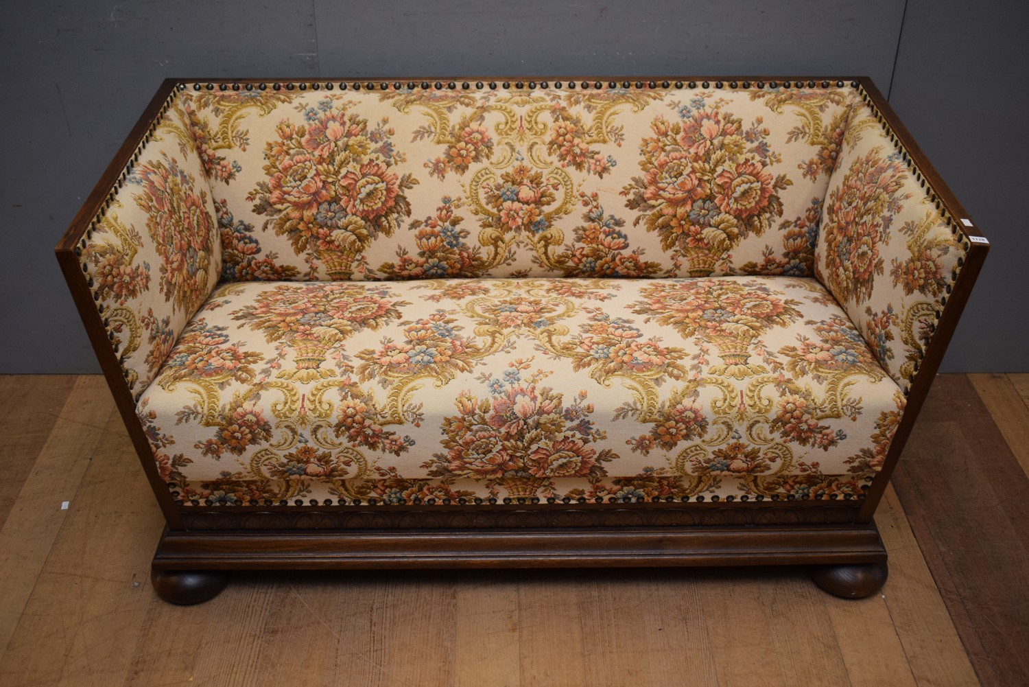 A EUROPEAN TWO SEATER UPHOLSTERED OAK SETTEE (72H x 132W x 67D CM) (PLEASE NOTE THIS HEAVY ITEM MUST BE REMOVED BY CARRIERS AT THE CUSTOMER'S EXPENSE. LEONARD JOEL STAFF CANNOT ASSIST CARRYING THIS ITEM) (X-LARGE ITEM)