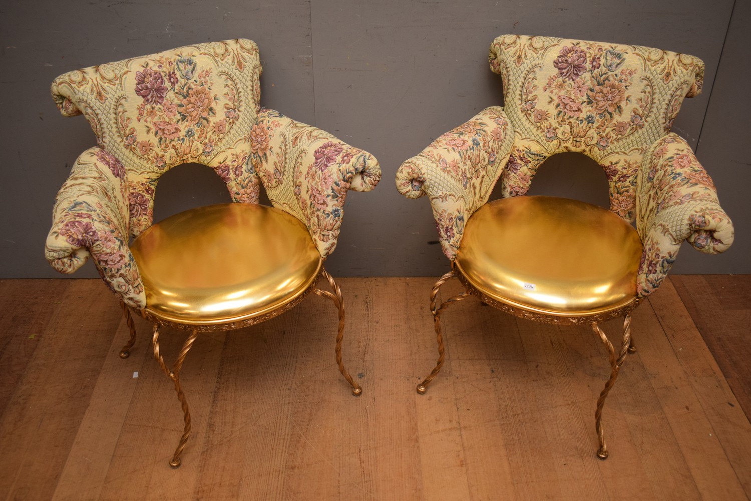 A DECORATIVE PAIR OF UPHOLSTERED CHAIRS WITH WROUGHT IRON FRAMES (82H x 75W x 60D CM) (LEONARD JOEL DELIVERY SIZE: LARGE)