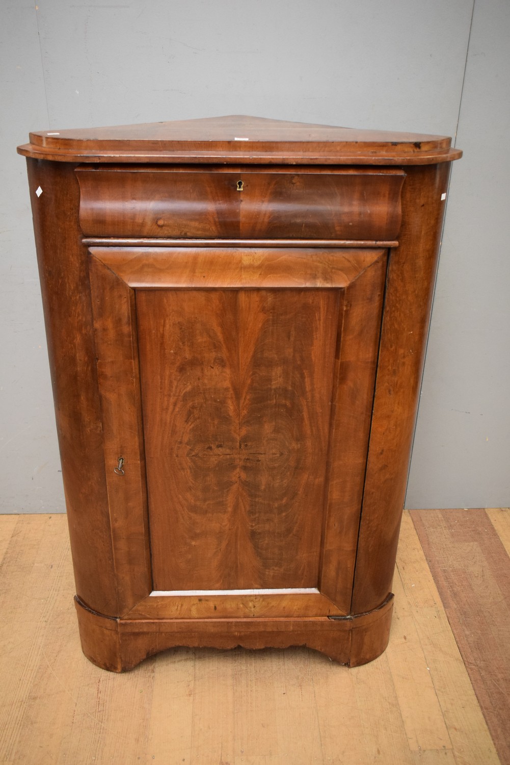 A BEIDERMEIER FLAME MAHOGANY CORNER CABINET (A/F) (138H x 89W x 52D CM) (PLEASE NOTE THIS HEAVY ITEM MUST BE REMOVED BY CARRIERS AT THE CUSTOMER'S EXPENSE. LEONARD JOEL STAFF CANNOT ASSIST CARRYING THIS ITEM) (X-LARGE ITEM)
