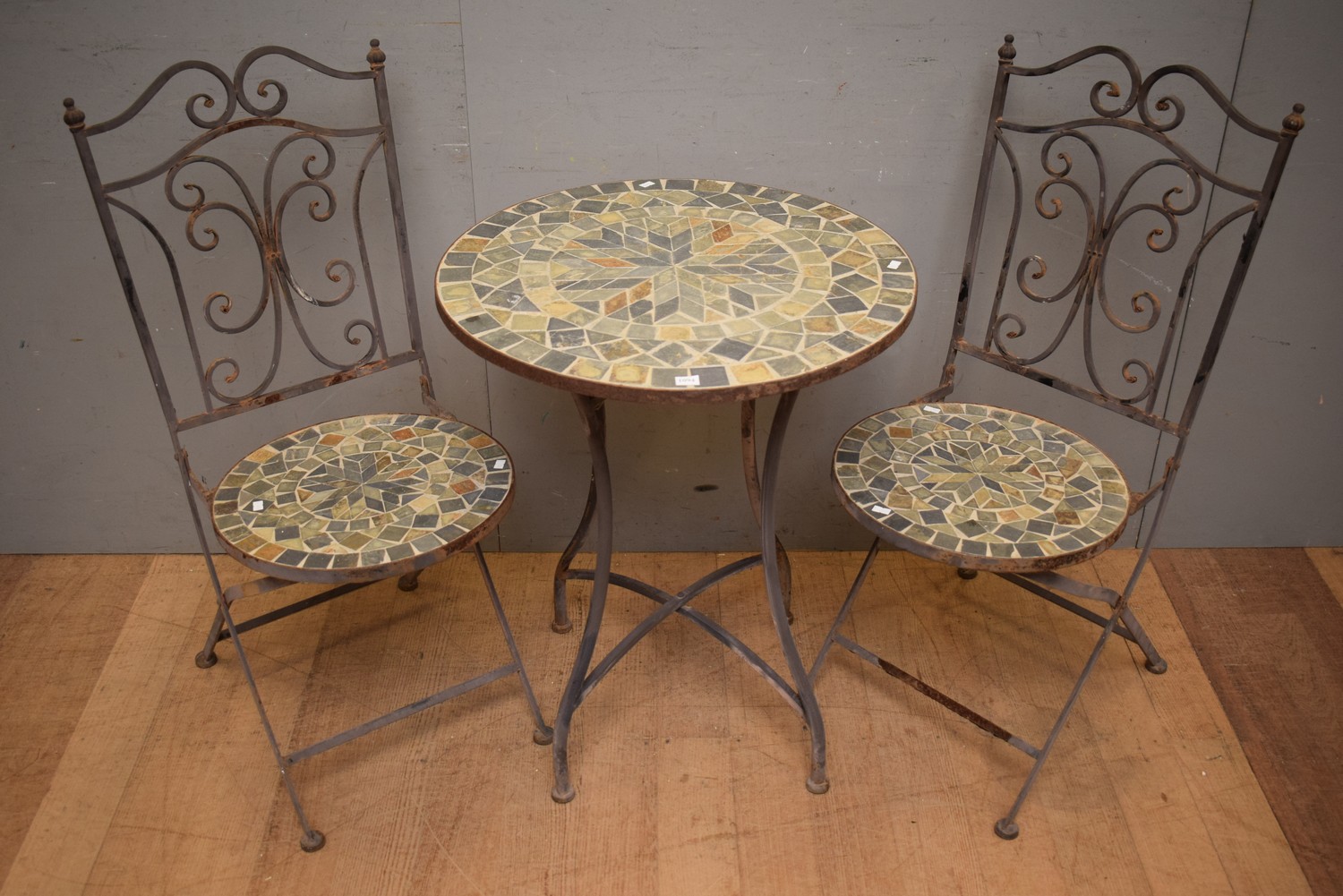 A TILED WROUGHT IRON OUTDOOR SETTING (A/F) (CHAIRS 94H x 40W x 47D CM) (LEONARD JOEL DELIVERY SIZE: LARGE)