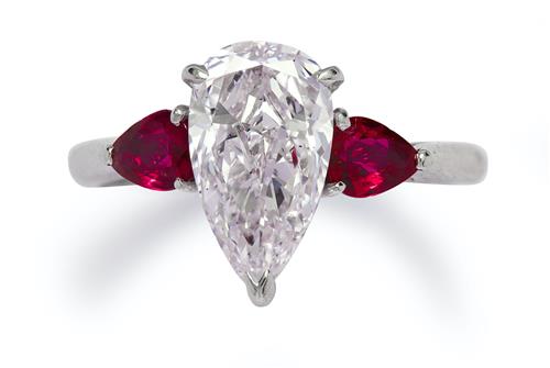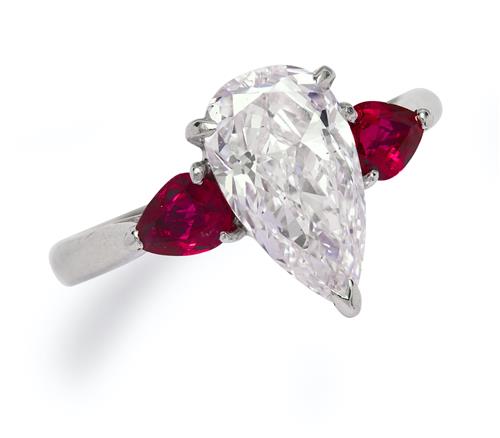 The fancy light pink pear-shaped brilliant-cut diamond stated to weigh 1.76 carats is claw-set between a pair of pear-shaped ruby shoulders, signed Raible, Cartier, numbered 70282, size L.