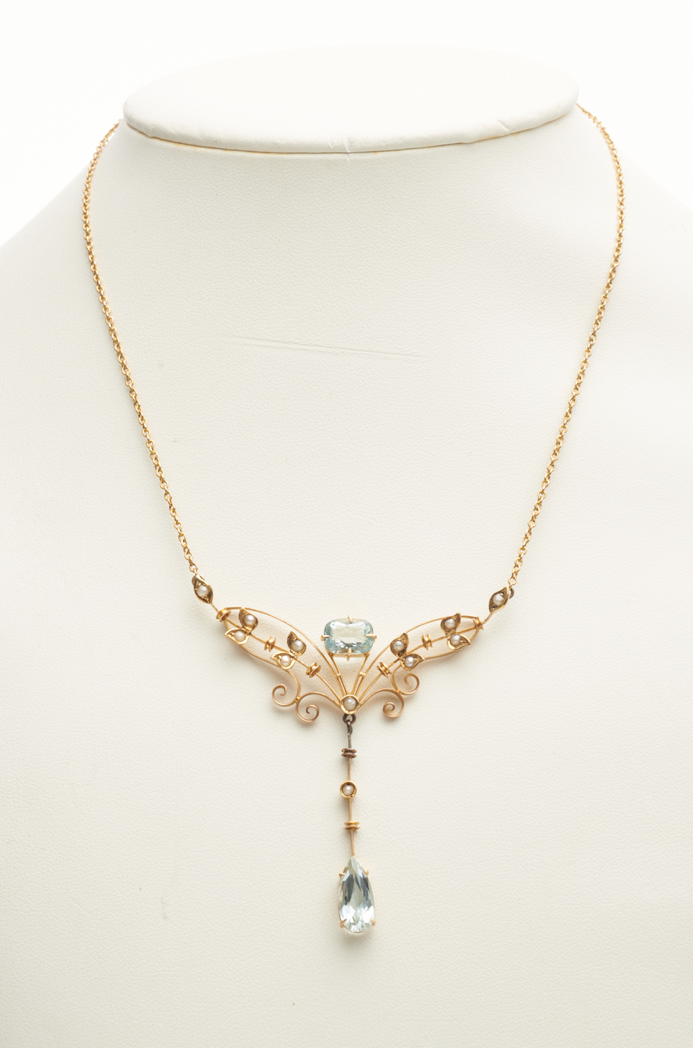 AN EDWARDIAN BLUE STONE DROP NECKLACE WITH SEED PEARL IN 14CT GOLD AND 9CT GOLD, LENGTH 41CM, 7.9GMS