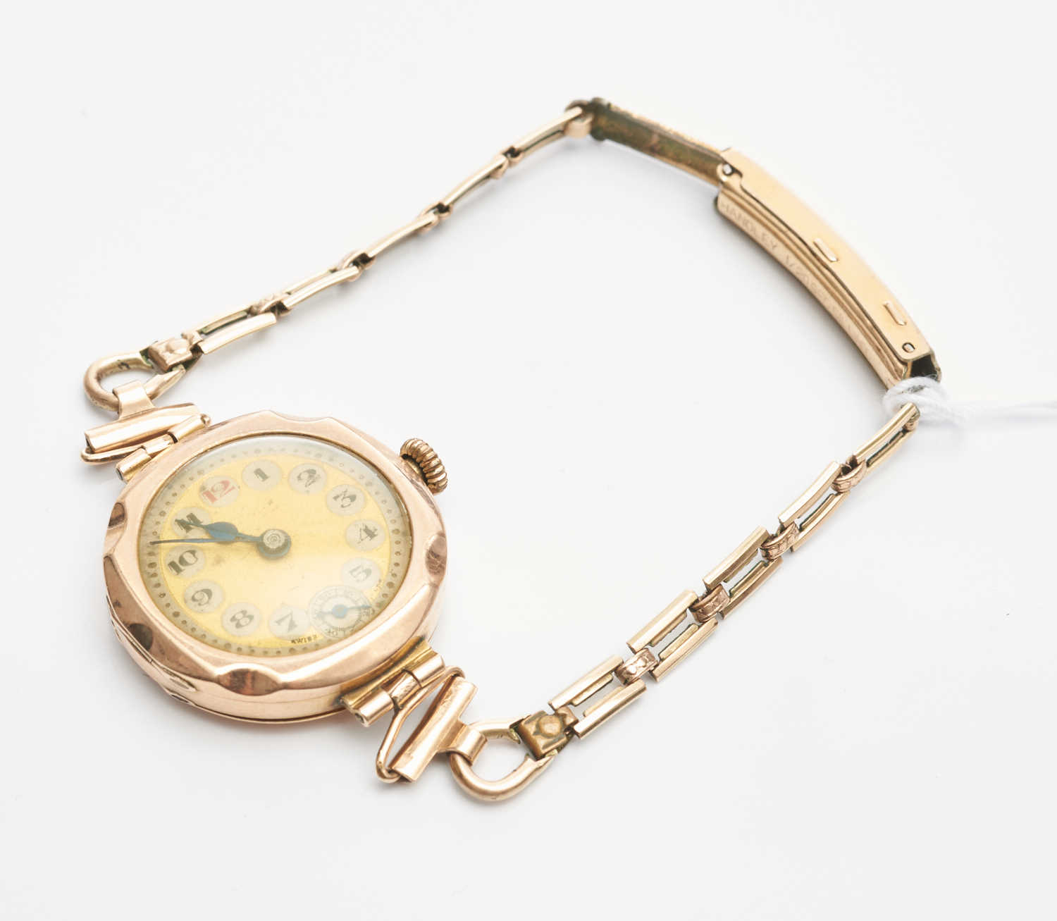AN ANTIQUE LADIES 'HANDLEY' WIND UP WRISTWATCH, FEATURING A GOLD FACE WITH FILIGREE DETAIL, IN 9CT GOLD, TO GOLD LINED BANDS, TOTAL WEIGHT 17.2GMS