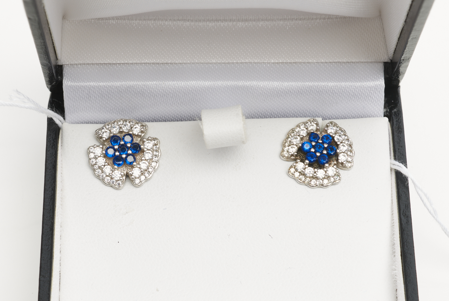 A PAIR OF SAPPHIRE AND CUBIC ZIRCONIA STUD EARRINGS IN STERLING SILVER, TO POST FITTINGS, BOXED