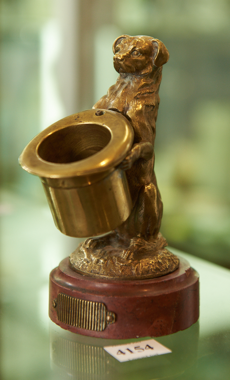 A BRONZE DOG WITH TOP HAT MATCH HOLDER H.14CM, LEONARD JOEL LOCAL DELIVERY SIZE: SMALL