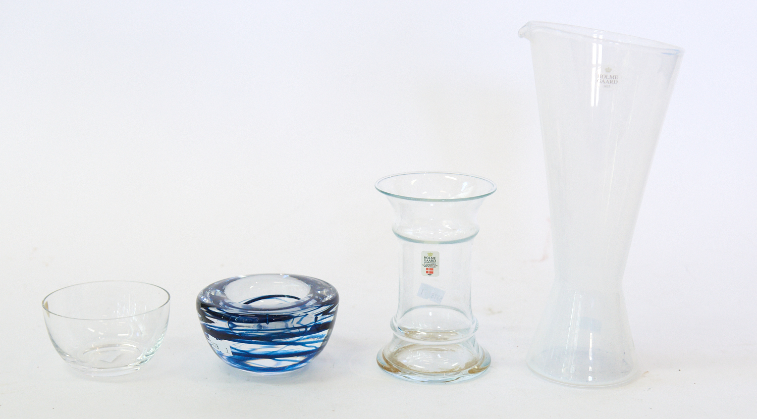 A COLLECTION OF SCANDINAVIAN GLASS INCLUDING BOWL BY KOSTA BODA, A CASED GLASS VASE HOLMEGAARD PITCHER, A HOLMEGAARD VASE AND A SMALL BOWL BY ORREFORS, LEONARD JOEL LOCAL DELIVERY SIZE: SMALL