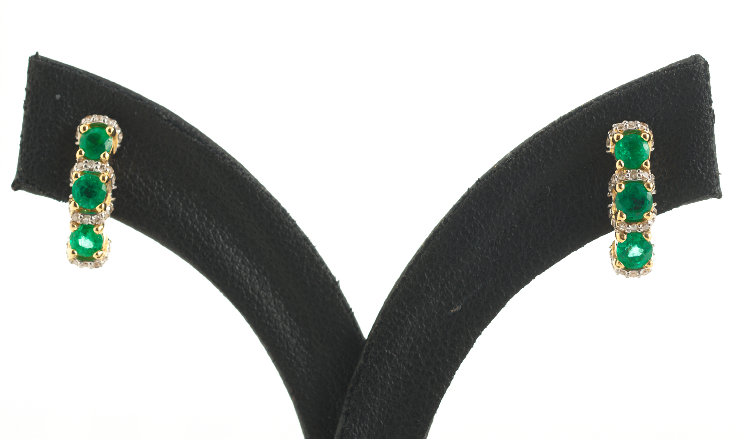 A PAIR OF COLUMBIAN EMERALD EARRINGS IN 18CT GOLD, COMPRISING SIX EMERALDS TOTALLING 0.61CTS AND DIAMONDS TOTALLING 0.11CT, TO POST AND BUTTERFLY FITTINGS, 2.16GMS