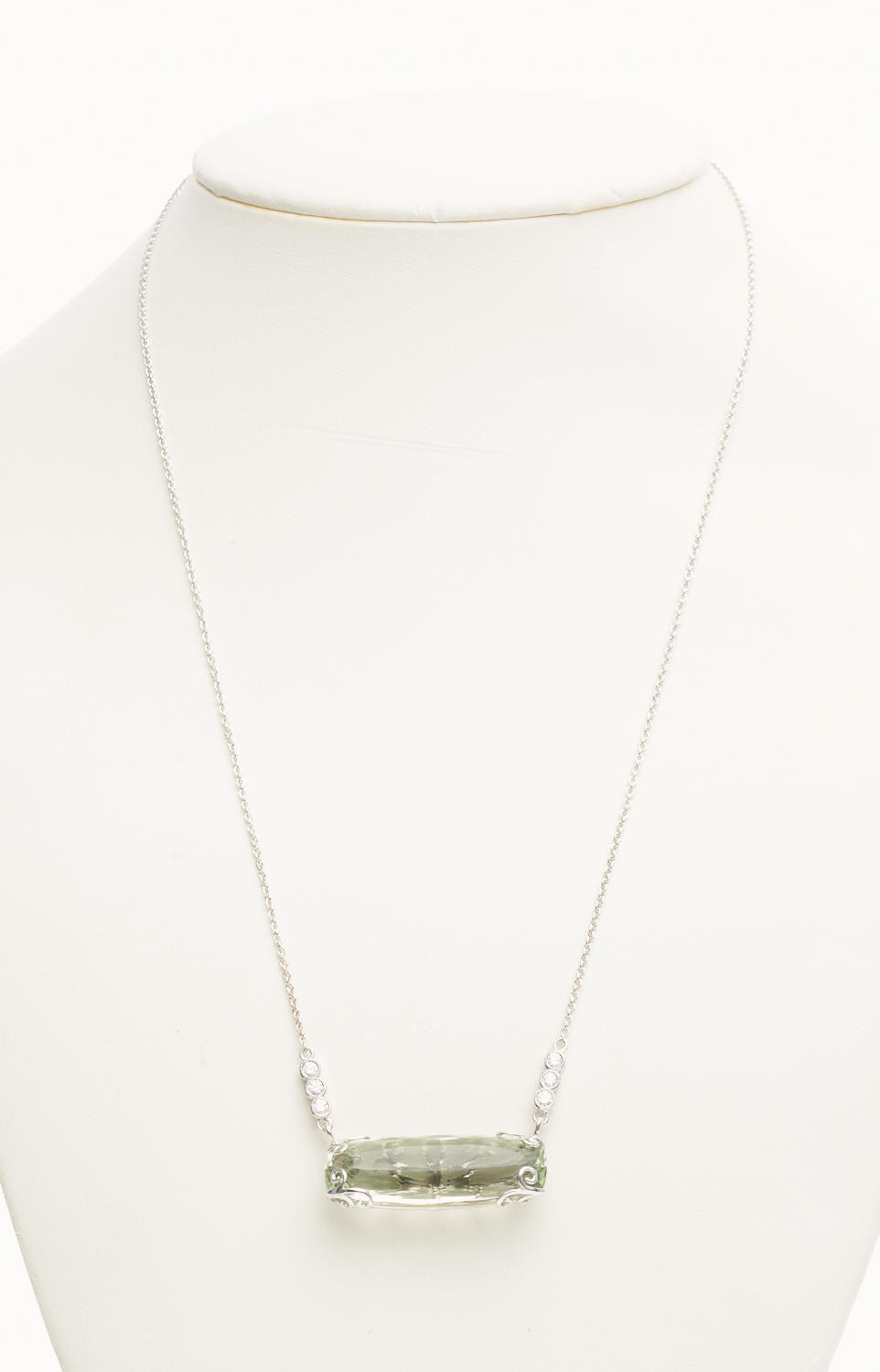 A GREEN QUARTZ AND DIAMOND DROP NECKLACE IN 10CT WHITE GOLD, FEATURING A RECTANGULAR CUSHION CUT GREEN QUARTZ WEIGHING 24.86CTS, WITH DIAMOND DETAIL, LENGTH 50CMS