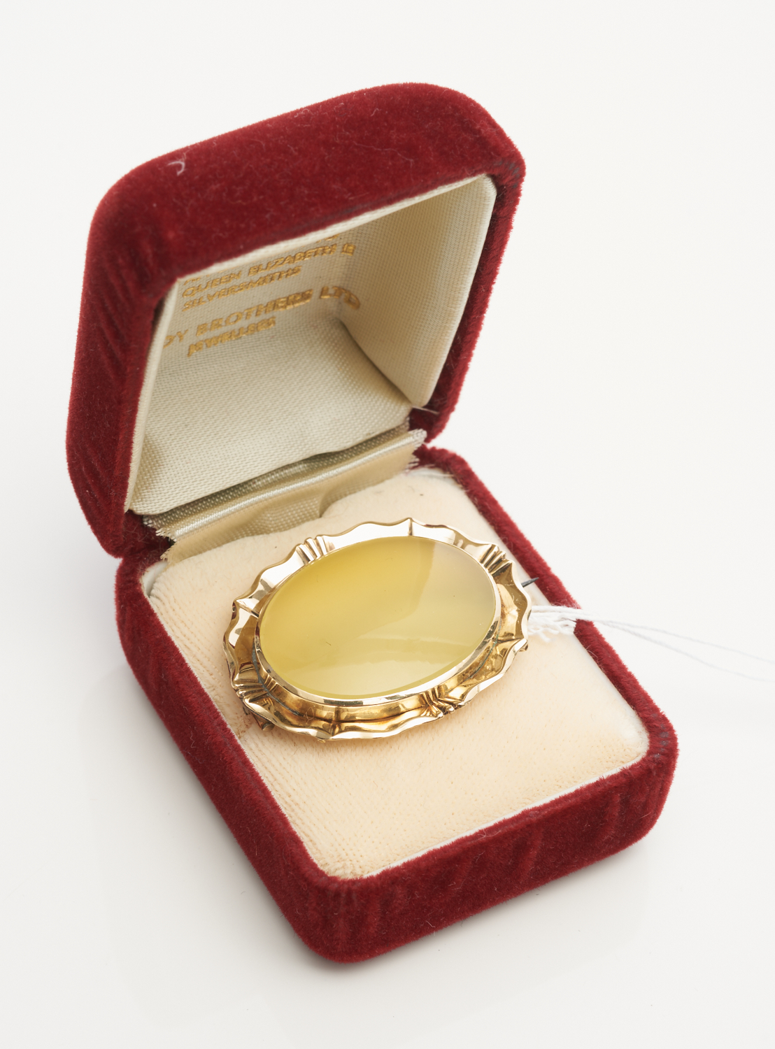 A VICTORIAN LEMON QUARTZ BROOCH IN 14CT GOLD, LENGTH 35MM