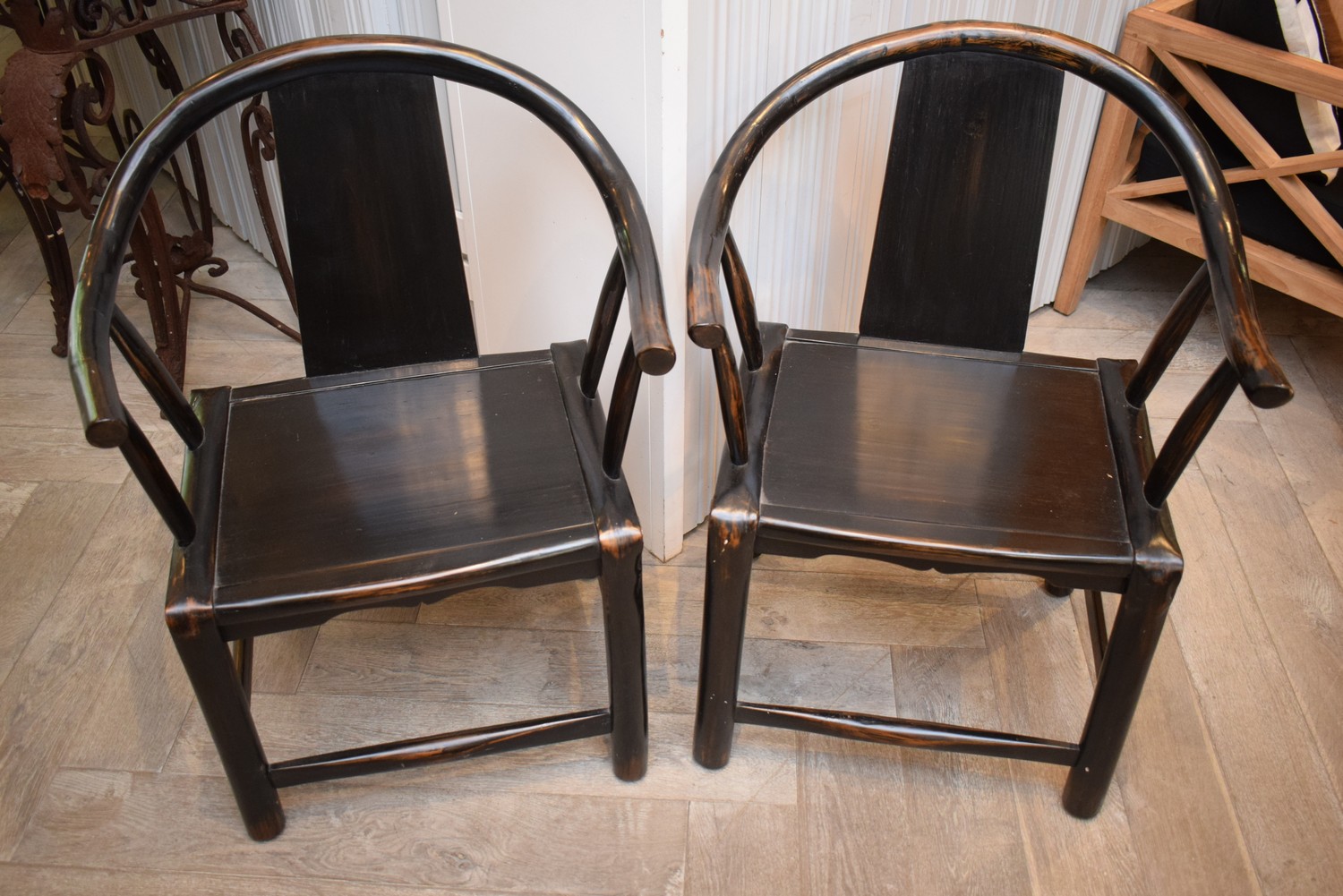 A PAIR OF BLACK LACQUERED CHINESE ARMCHAIRS (89H x 68W x 61D CM) (LEONARD JOEL DELIVERY SIZE: LARGE)