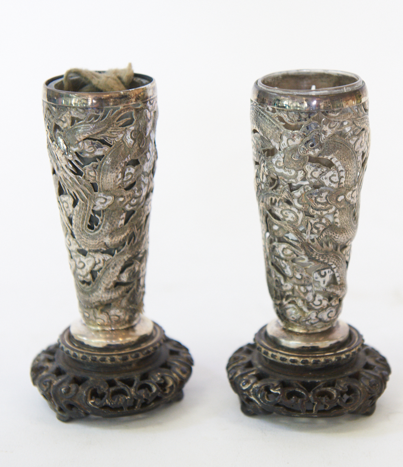 SILVER VASES WITH DRAGON DECORATION AND GLASS LINERS (A/F TO LINER) H.14CM, LEONARD JOEL LOCAL DELIVERY SIZE: SMALL