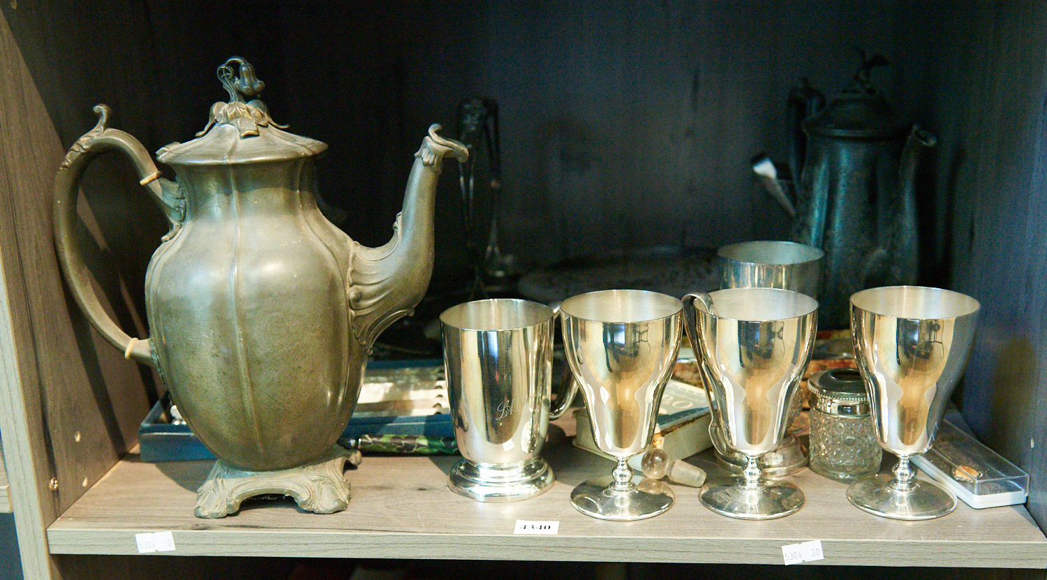 A SHELF OF ASSORTED EPNS ITEMS, LEONARD JOEL LOCAL DELIVERY SIZE: SMALL