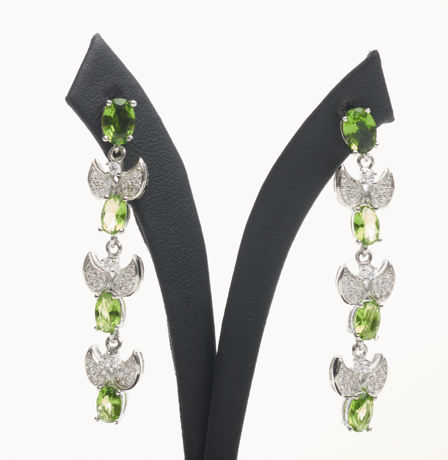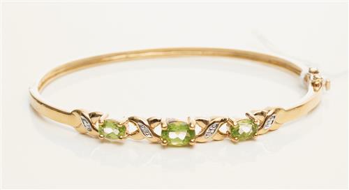 A PAIR OF PERIDOT AND CUBIC ZIRCONIA EARRINGS IN STERLING SILVER, TO POST FITTINGS (LENGTH 45MM), TOGETHER WITH A BANGLE IN SILVER GILT