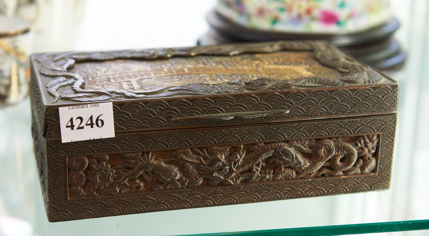 A JAPANESE BRASS EMBOSSED CIGARETTE BOX WITH DRAGON MOTIF AND WOODEN LINER W.18CM, LEONARD JOEL LOCAL DELIVERY SIZE: SMALL
