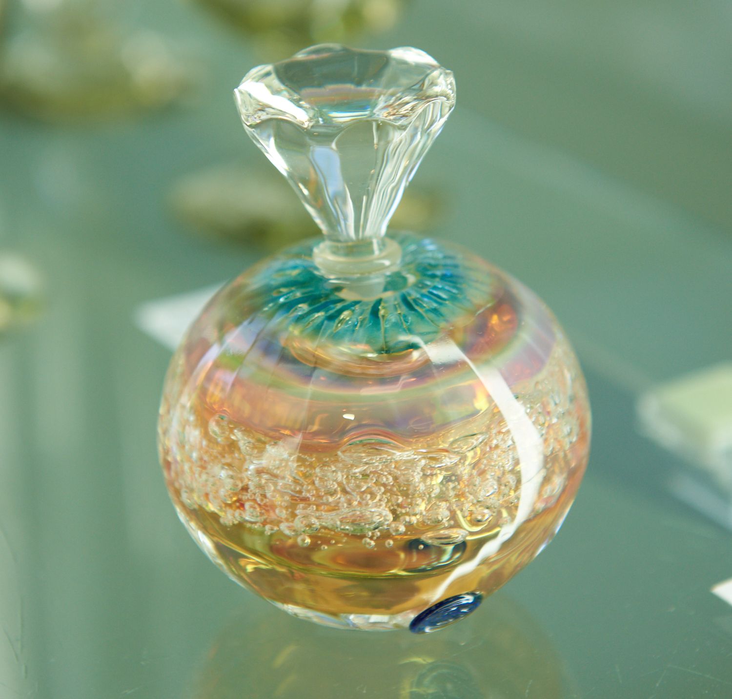 A RICHARD CLEMENTS ART GLASS PERFUME BOTTLE OF SQUAT FORM WITH ROUND PINK STOPPER H.7.6CM, LEONARD JOEL LOCAL DELIVERY SIZE: SMALL