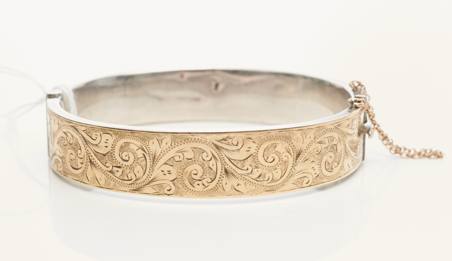 AN ENGRAVED HINGED BANGLE IN 9CT GOLD PLATED ON STERLING SILVER, INNER DIAMETER 6CMS