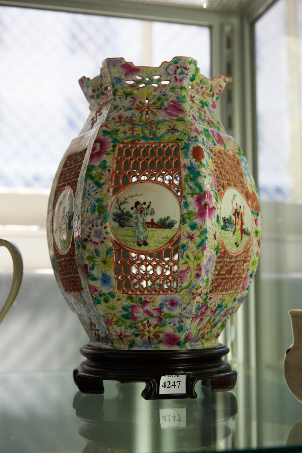 A FAMILLE ROSE RETICULATED CHINESE LAMPSHADE ON WOODEN BASE H.33CM, LEONARD JOEL LOCAL DELIVERY SIZE: SMALL