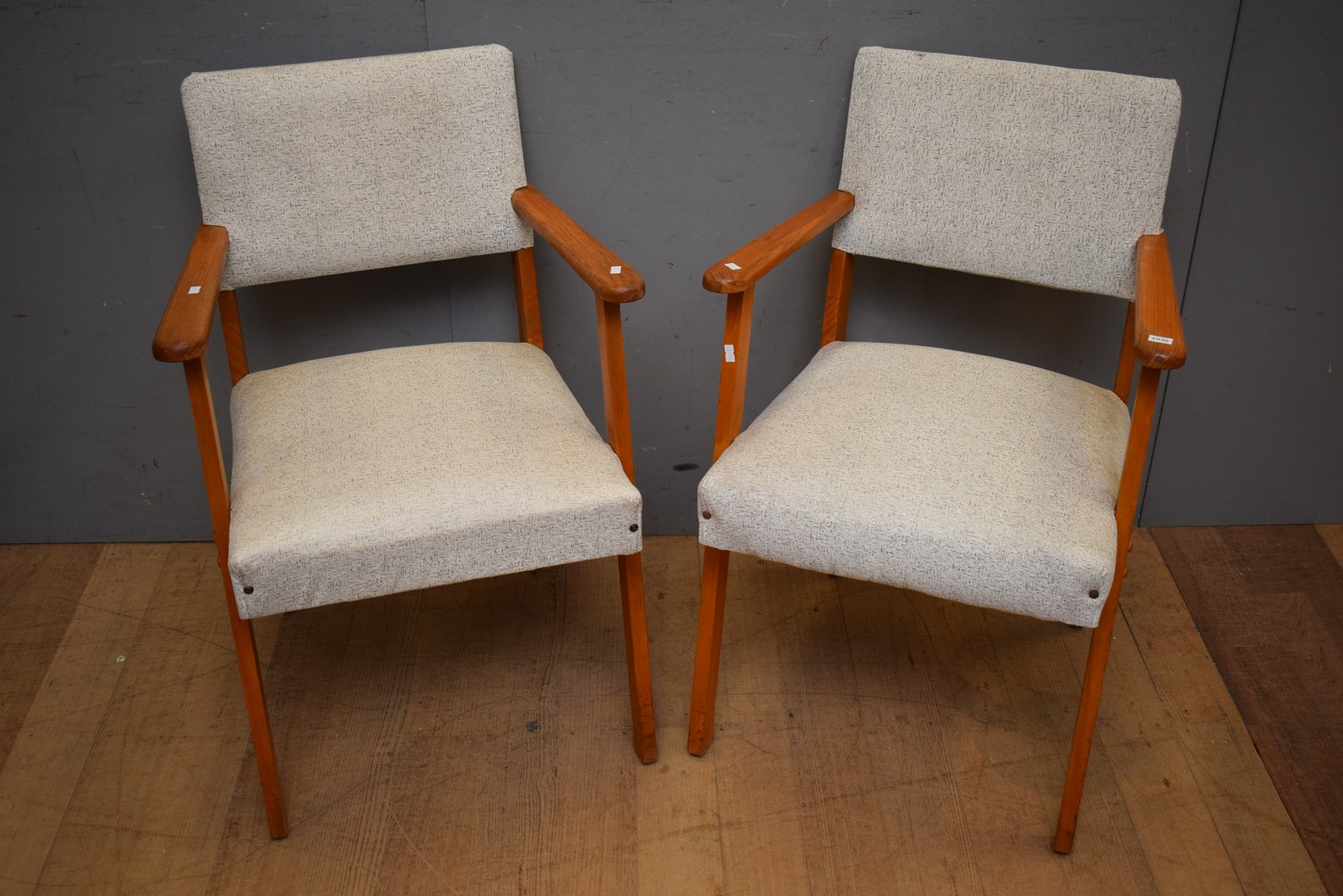A PAIR OF WHITE VINYL 1950S ARMCHAIRS (A/F) (82H x 49W x 59D CM) (LEONARD JOEL DELIVERY SIZE: MEDIUM)