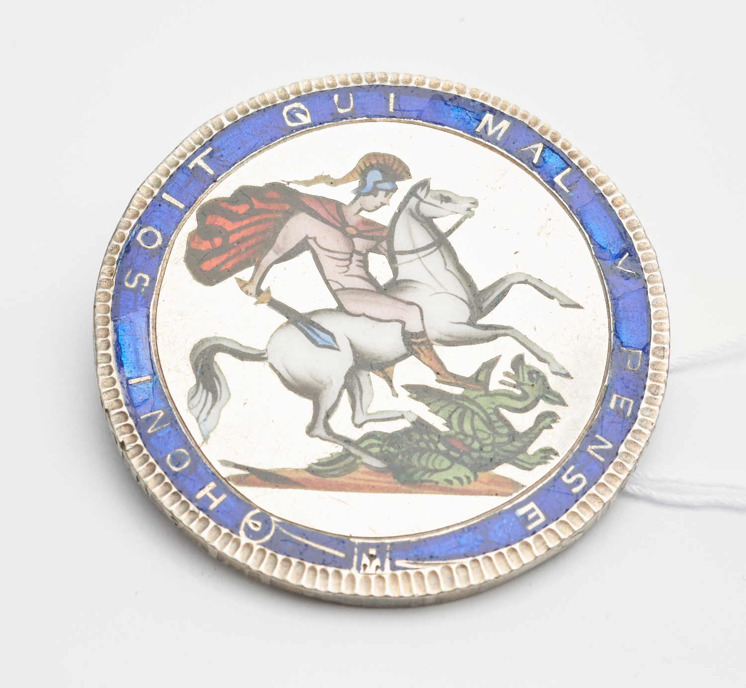 A GEORGIAN ENAMEL COIN BROOCH, DATED 1818, FEATURING ST GEORGE AND THE DRAGON, DIAMETER 35MM