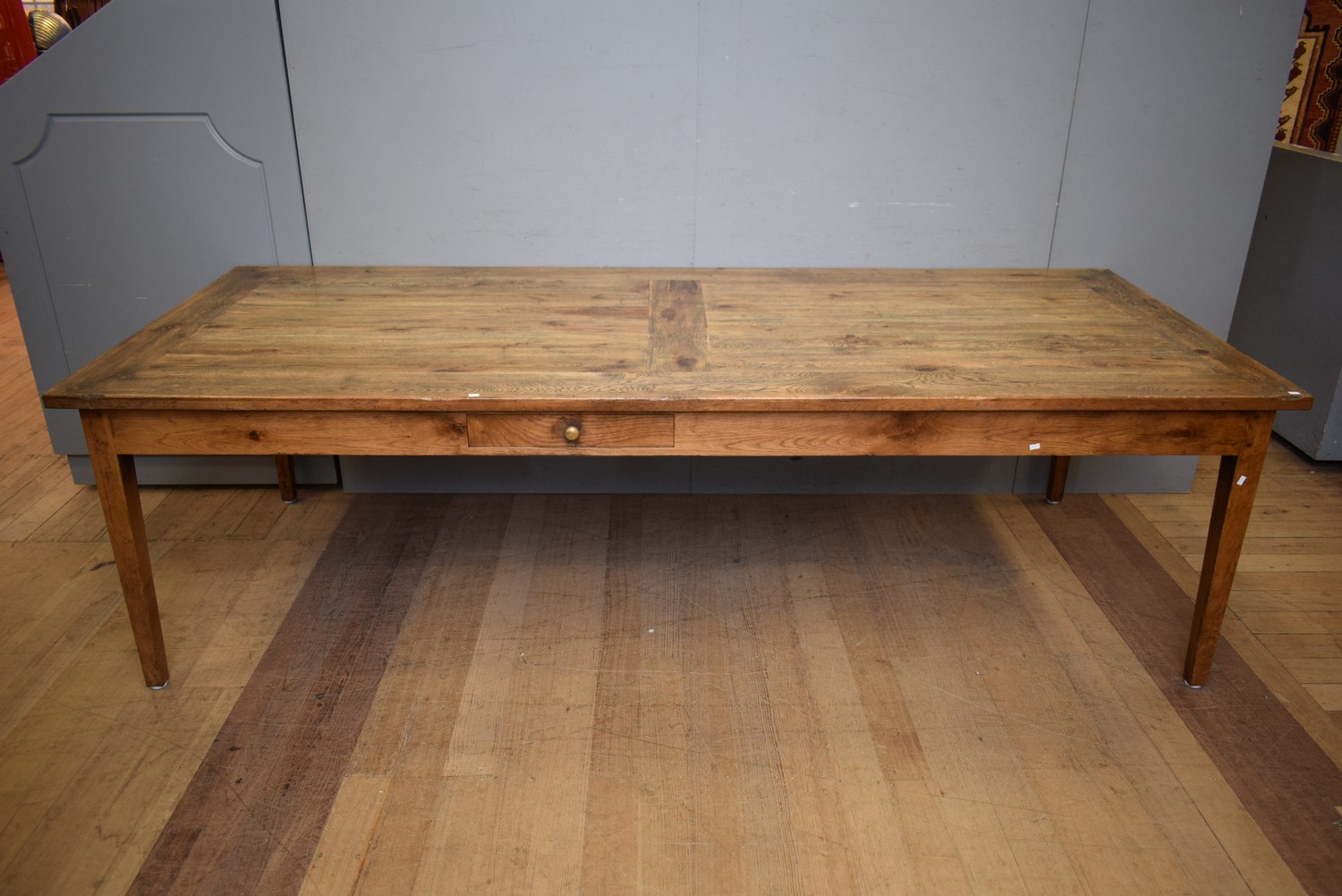 A TAPER LEG OAK DINING TABLE WITH TWO DRAWERS (79H x 270W x 110D CM) (PLEASE NOTE THIS HEAVY ITEM MUST BE REMOVED BY CARRIERS AT THE CUSTOMER'S EXPENSE. LEONARD JOEL STAFF CANNOT ASSIST CARRYING THIS ITEM) (X-LARGE ITEM)