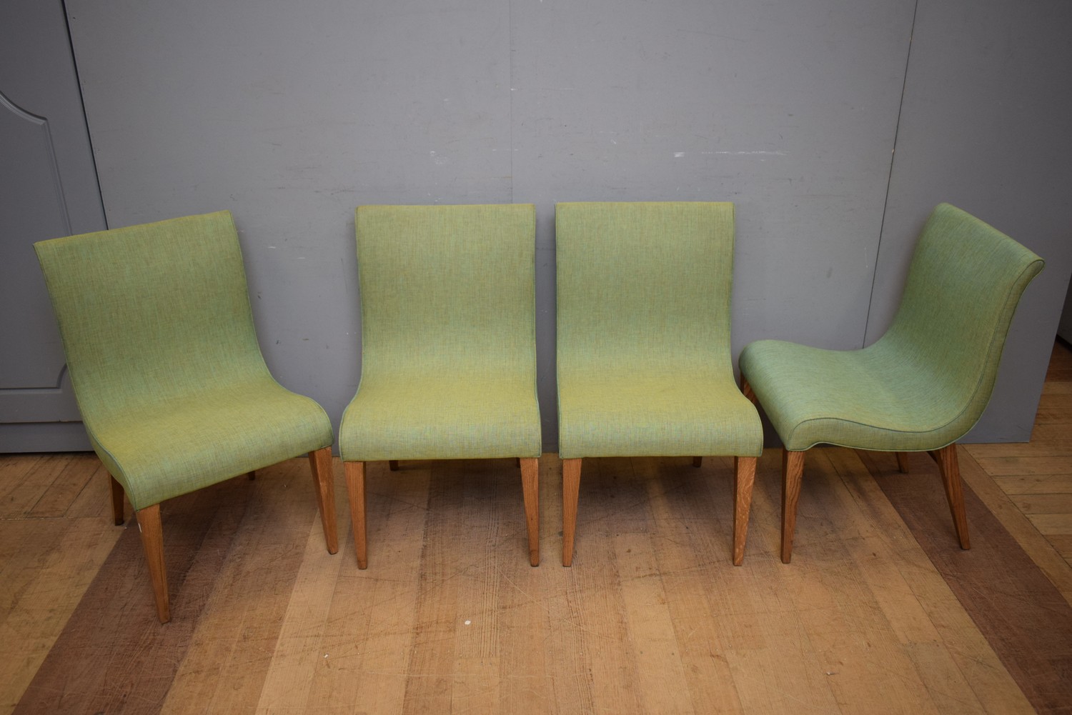 FOUR FRENCH CONTEMPORARY CLASSIC CHAIRS IN OAK WITH NEW UPHOLSTERY (87H x 52W x 59D CM) (LEONARD JOEL DELIVERY SIZE: LARGE)