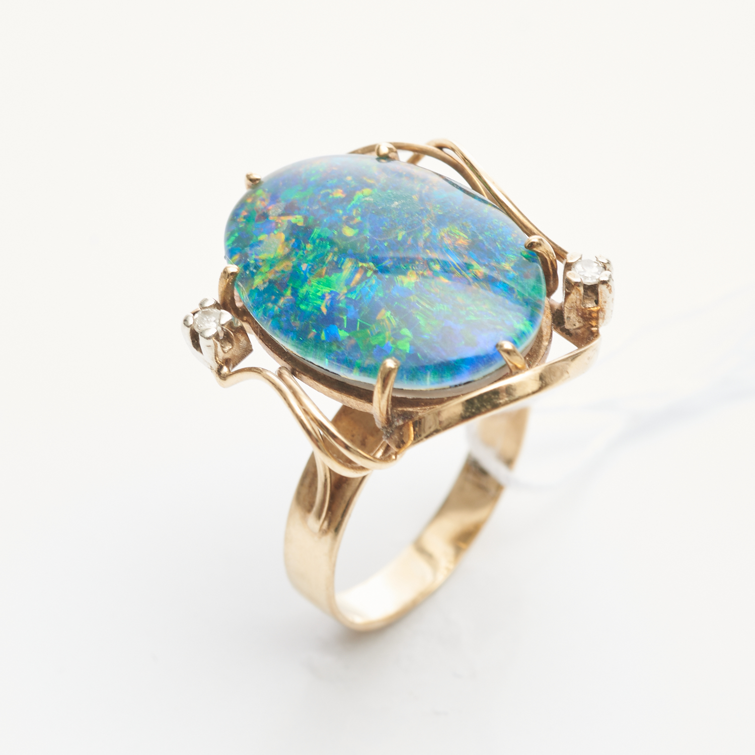 A VINTAGE OPAL TRIPLET AND DIAMOND RING IN 9CT GOLD, SIZE J, 4.6GMS