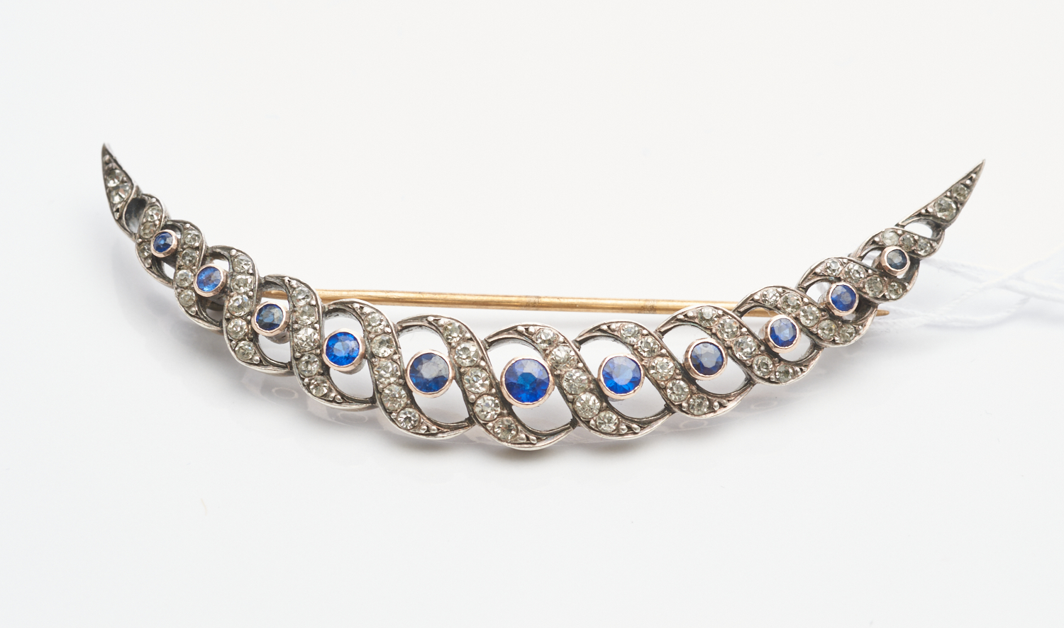 A BLUE PASTE CRESCENT BROOCH IN SILVER, LENGTH 65MM