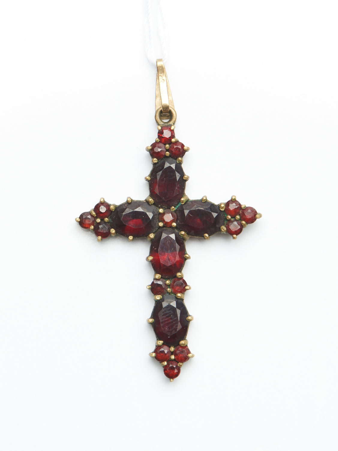 A BOHEMIAN GARNET CROSS IN GILT, LENGTH 40MM