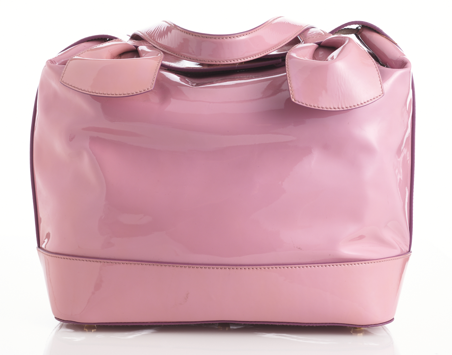 A VICTOR AND ROLF HANDBAG IN DUSTY ROSE PINK PATENT LEATHER, WITH LIGHT GOLD PROTECTIVE FEET AND ZIP AND BUCKLE CLOSURE