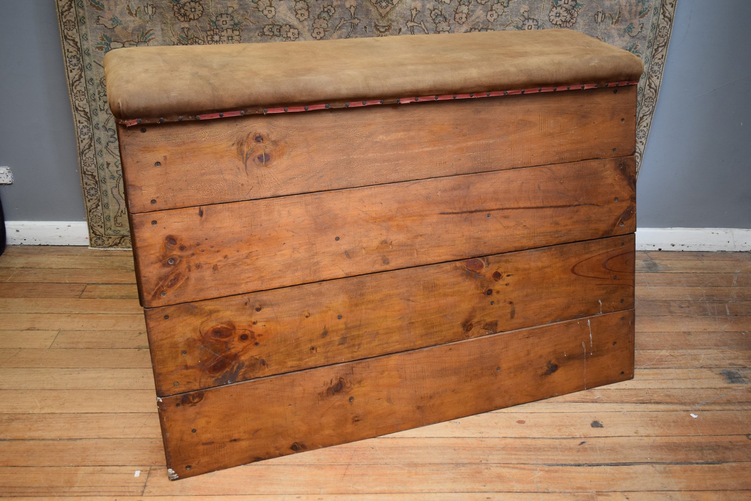 A VINTAGE FOUR SECTIONAL VAULTING HORSE IN A WOODEN FRAME AND LEATHER TOP (A/F) (98H x 154W x 93D CM) (PLEASE NOTE THIS HEAVY ITEM MUST BE REMOVED BY CARRIERS AT THE CUSTOMER'S EXPENSE. LEONARD JOEL STAFF CANNOT ASSIST CARRYING THIS ITEM) (X-LARGE ITEM)