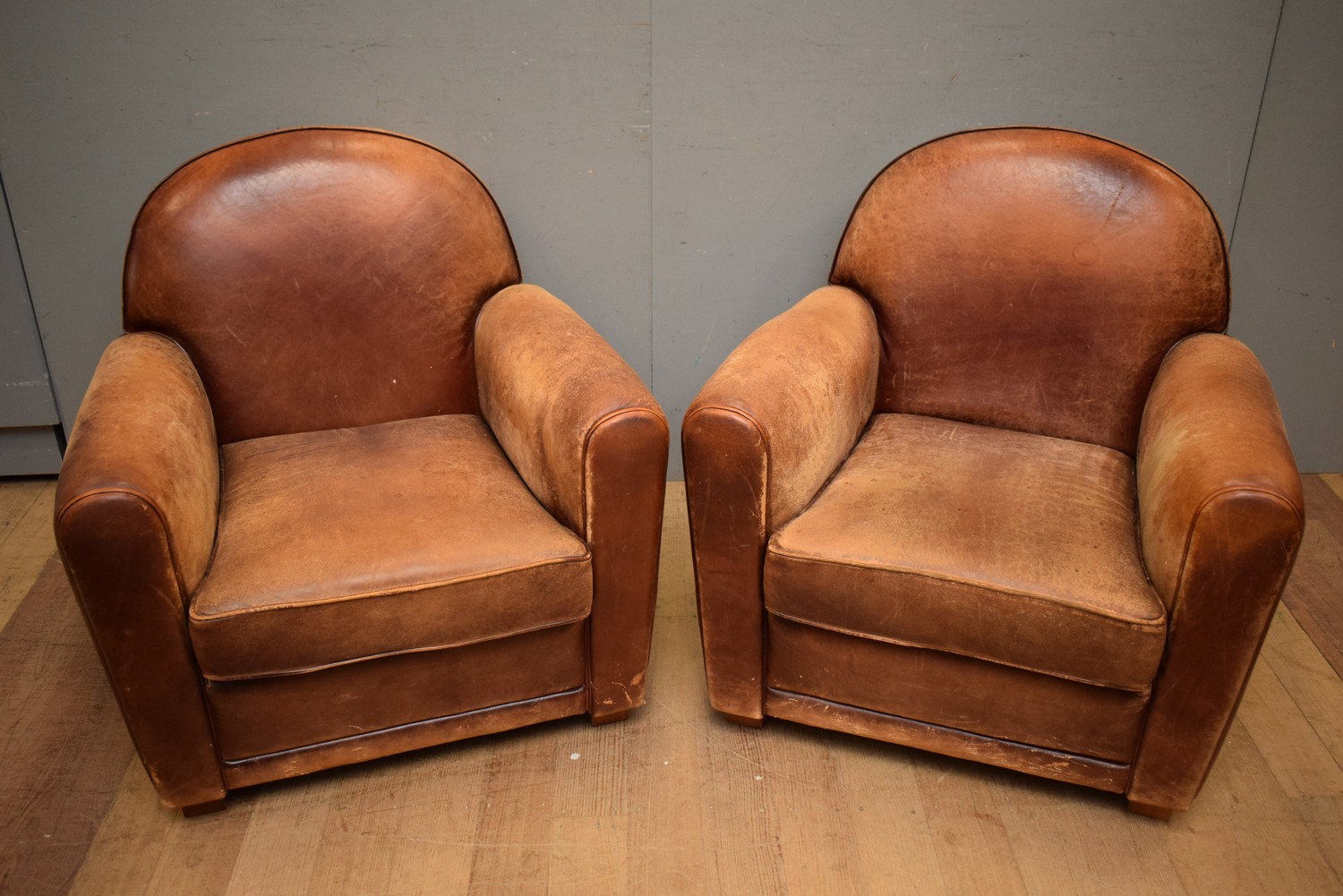 A PAIR OF FRENCH VINTAGE LEATHER CLUB CHAIRS (80H x 80W x 87D CM) (LEONARD JOEL DELIVERY SIZE: LARGE)