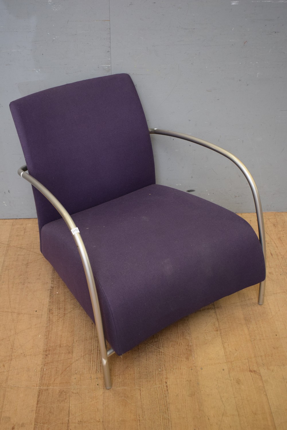 A CONTEMPORARY CHROME CHAIR WITH PURPLE UPHOLSTERY (71H x 71W x 84D CM) (LEONARD JOEL DELIVERY SIZE: LARGE)