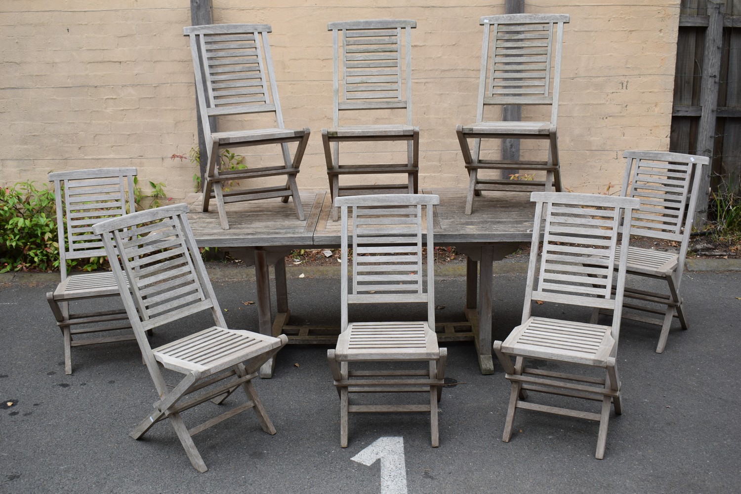 A NINE PIECE TEAK OUTDOOR SETTING WITH EXTENSION DINING TABLE AND EIGHT FOLDABLE CHAIRS (A/F) (77H x 218W x 100D CM) (UNEXTENDED 161W CM) (PLEASE NOTE THIS HEAVY ITEM MUST BE REMOVED BY CARRIERS AT THE CUSTOMER'S EXPENSE. LEONARD JOEL STAFF CANNOT ASSIST CARRYING THIS ITEM) (X-LARGE ITEM)