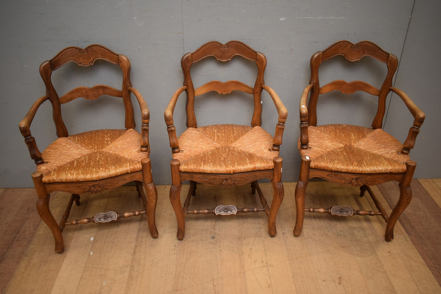 A SET OF THREE RUSH SEATED CARVED TIMBER LADDERBACK CARVERS (89H x 54W x 45D CM) (LEONARD JOEL DELIVERY SIZE: MEDIUM)