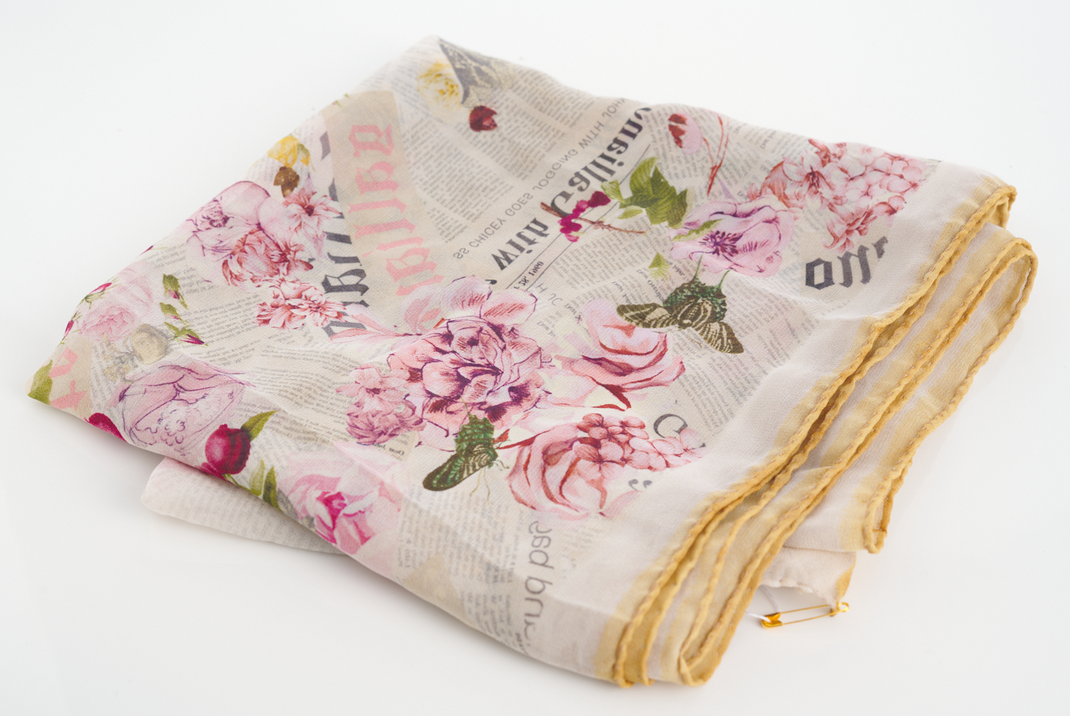 A JOHN GALLIANO LONG SILK ORGANZA SCARF FEATURING SIGNATURE GAZETTE PRINT ON FRUIT AND FLORAL BEIGE BACKGROUND