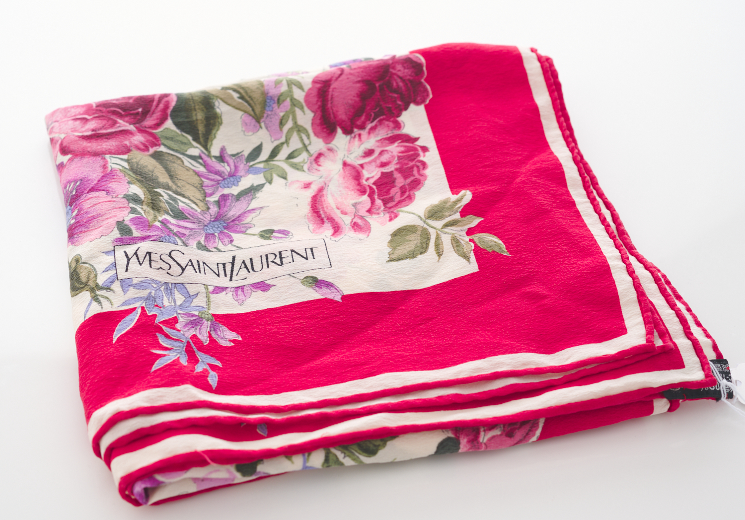 AN YVES SAINT LAURENT LARGE SQUARE SCARF IN RED AND BEIGE FLORAL SILK