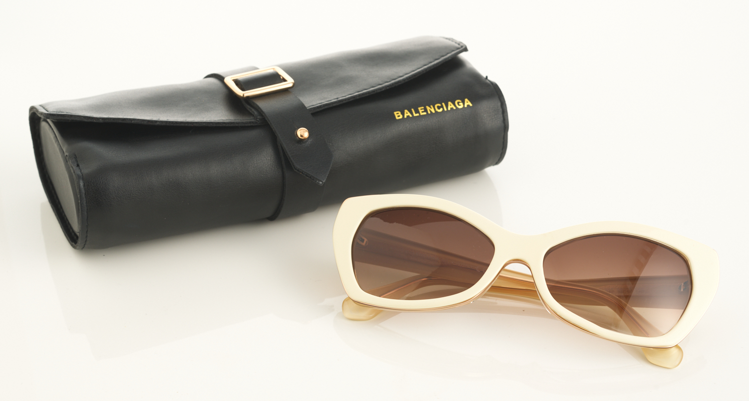 A PAIR OF BALENCIAGA OVERSIZED SOFT CAT EYE SUNGLASSES, FEATURING BROWN TONED GRADIENT LENSES, A CREAM AND GOLD FRAME, WITH ORIGINAL SOFT LEATHER PROTECTIVE POUCH