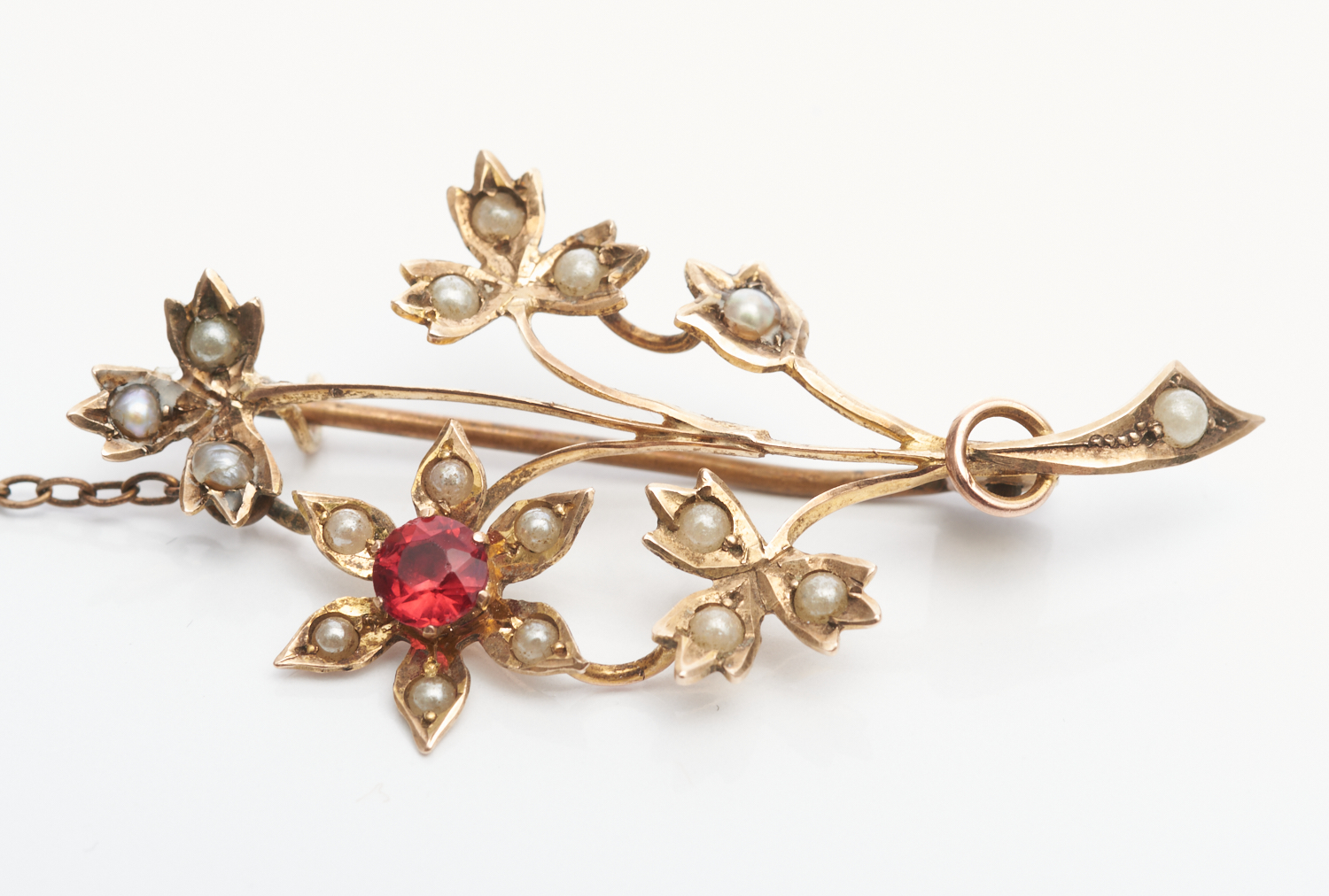 AN ANTIQUE AUSTRALIAN RED STONE AND SEED PEARL BROOCH BY WILLIS OF MELBOURNE IN 9CT GOLD, LENGTH 40MM, 3GMS