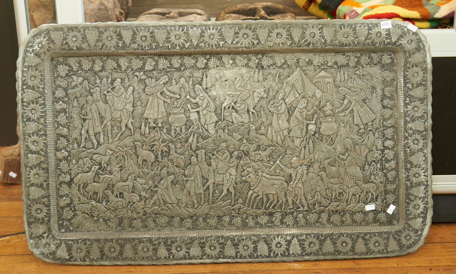 A LARGE PERSIAN RECTANGULAR SILVERED COPPER TRAY WITH EMBOSSED DECORATION (97 CM W), LEONARD JOEL LOCAL DELIVERY SIZE: SMALL