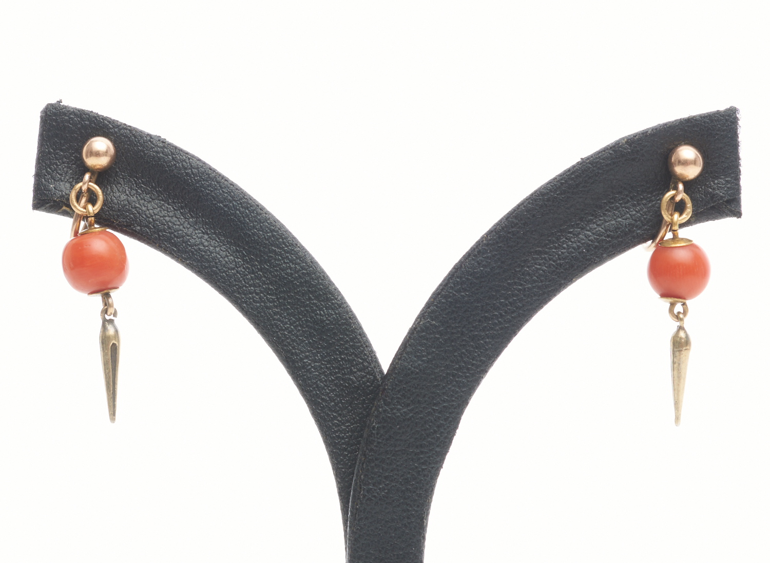 AN ANTIQUE PAIR OF CORAL EARRINGS IN 9CT GOLD BY DUNKLINGS OF MELBOURNE, TO SCREW BACK FITTINGS, LENGTH 25MM, 2.7GMS