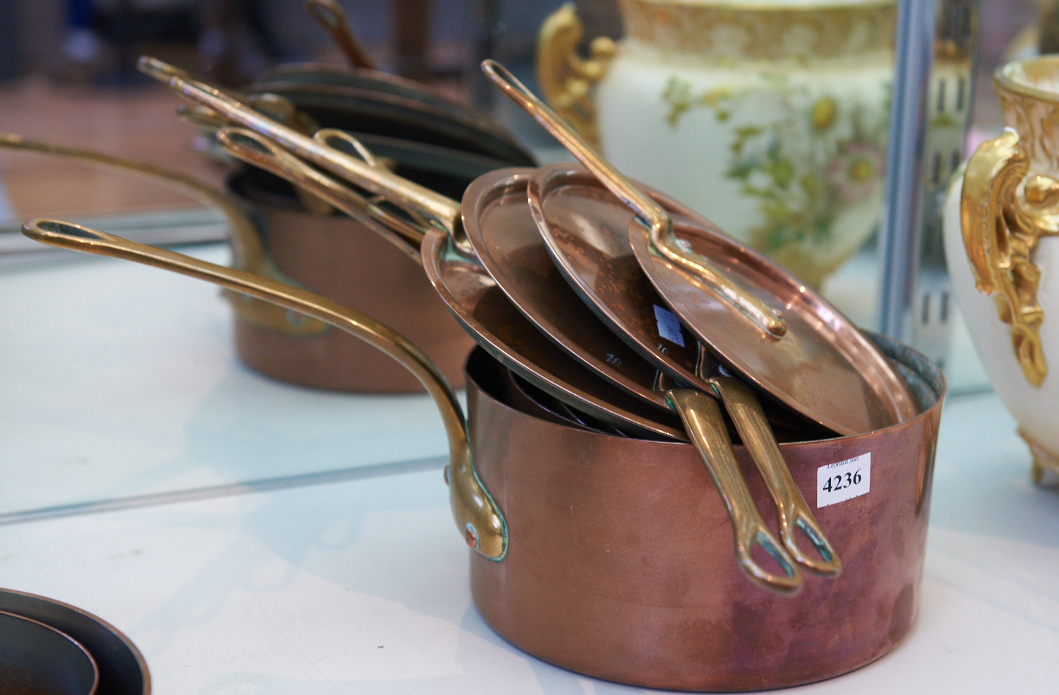 A SET OF FIVE FRENCH COPPER SAUCEPANS WITH LIDS DIA.21CM, LEONARD JOEL LOCAL DELIVERY SIZE: SMALL