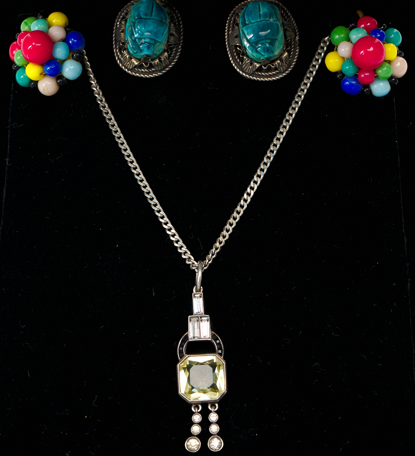 A COLLECTION OF VINTAGE JEWELLERY, INCLUDING GEM-SET ART DECO PENDANT, GEM-SET CLUSTER EARRINGS & SILVER SCARAB EARRINGS.