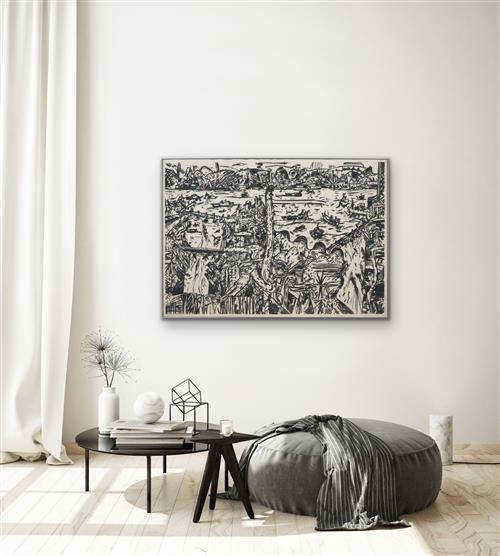 Light cockling to the paper. Minor scratches to the perspex and the frame is slightly bowed. Overall framed size is 117 x 166cm