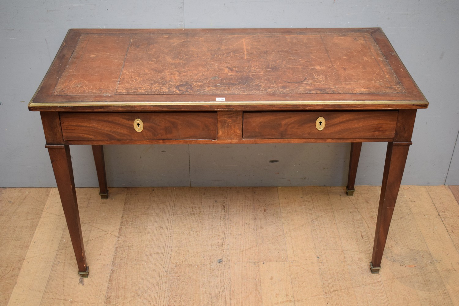 AN ANTIQUE LEATHER INLAID TABLE WITH BRASS DETAILING (A/F) (72H x 113W x 57D CM) (LEONARD JOEL DELIVERY SIZE: LARGE)