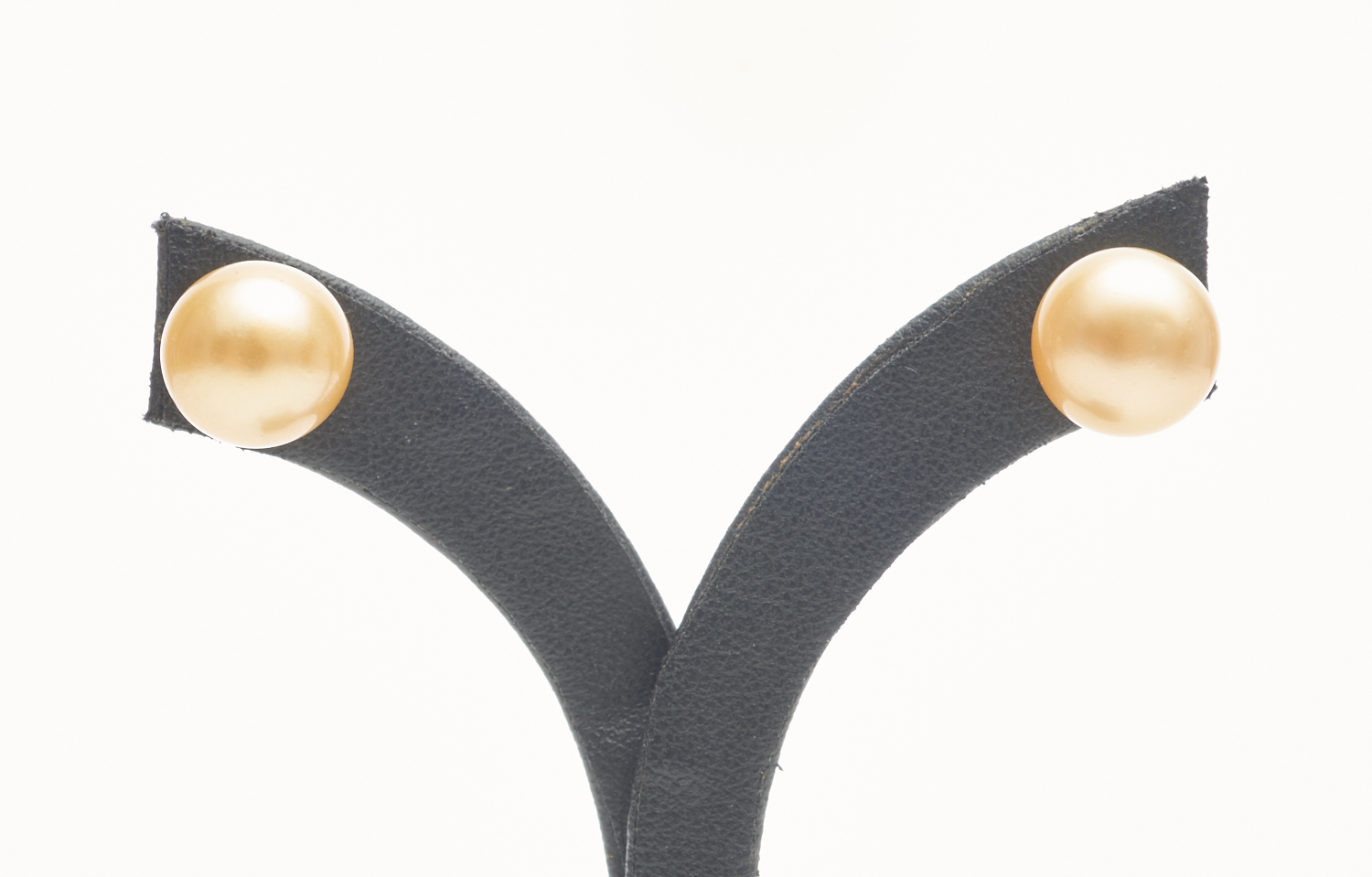 A PAIR OF GOLDEN SOUTH SEA PEARL STUD EARRINGS IN 18CT GOLD, EACH EARRING COMPRISING A ROUND PEARL OF GOLDEN HUES MEASURING 11.0MM, TO POST AND BUTTERFLY FITTINGS