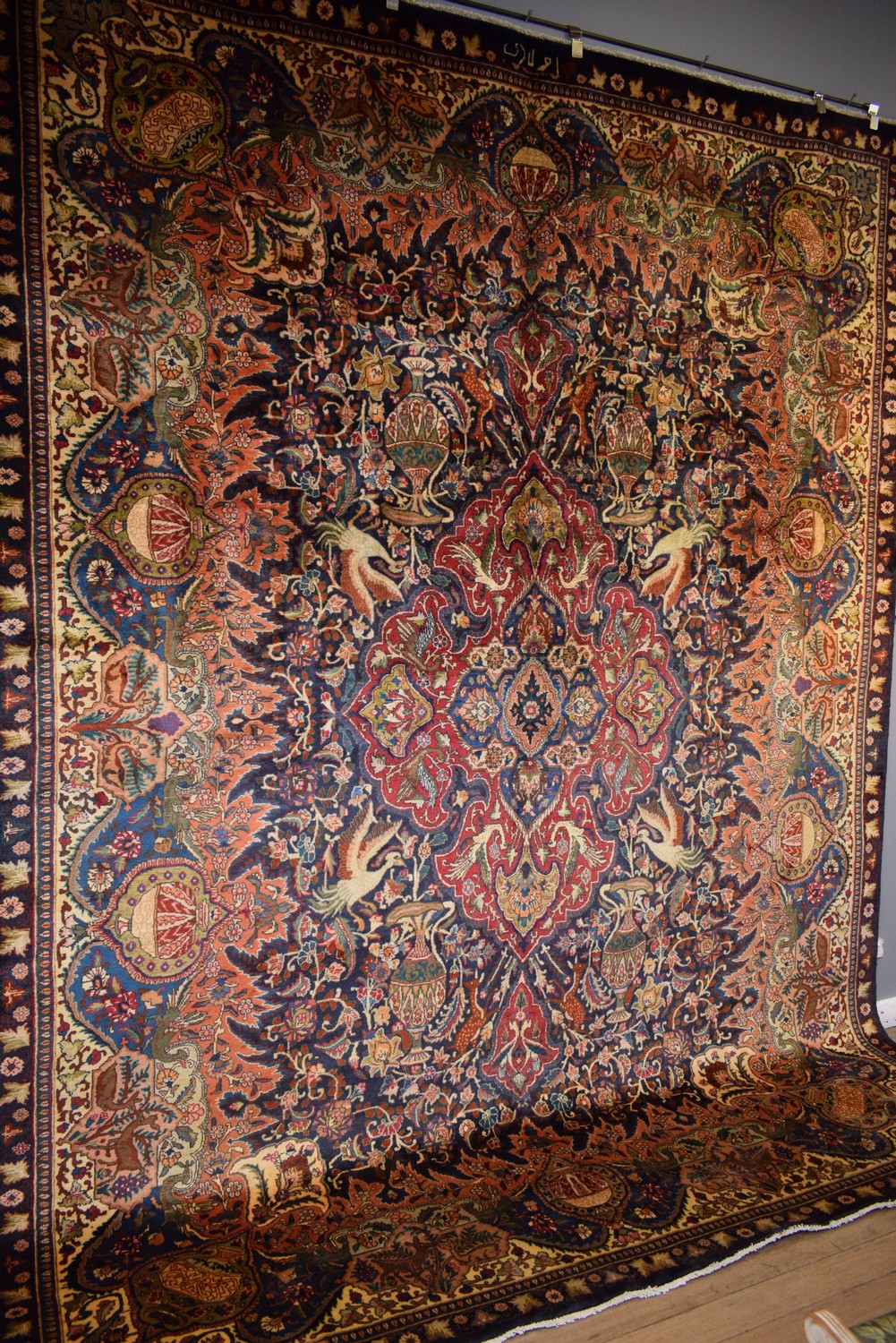 A FIRST TIME OFFERED PERSIAN ROYAL KASHMAR ARCHAEOLOGY CARPET. 100% WOOL PILE. FINELY HAND-KNOTTED IN THE KASHMAR REGION OF THE KHORASAN PROVINCE & WITH A UNIQUE "ARCHAEOLOGY INSCRIBED (OLADI STUDIO) TREASURE" DESIGN OF BOLD MEDALLION CONTAINING PERSIAN MYTHICAL SIMORGH BIRDS & QUARTERED CORNER MEDALLIONS IN A ROYAL BLUE FIELD OF EXCAVATED ANTIQUE URNS, SYMORGH BIRDS (BIRDS OF PHOENIX), PALMETTES & TENDRILS. BORDER OF EXCAVATED URNS & SIMORGH BIRDS. GALLERY EXHIBITED. IN PRISTINE CONDITION. CERTIFICATE OF AUTHENTICITY INCLUDED. SIZE: 390X296CM ORIGIN: PERSIA - RRP: $9,900