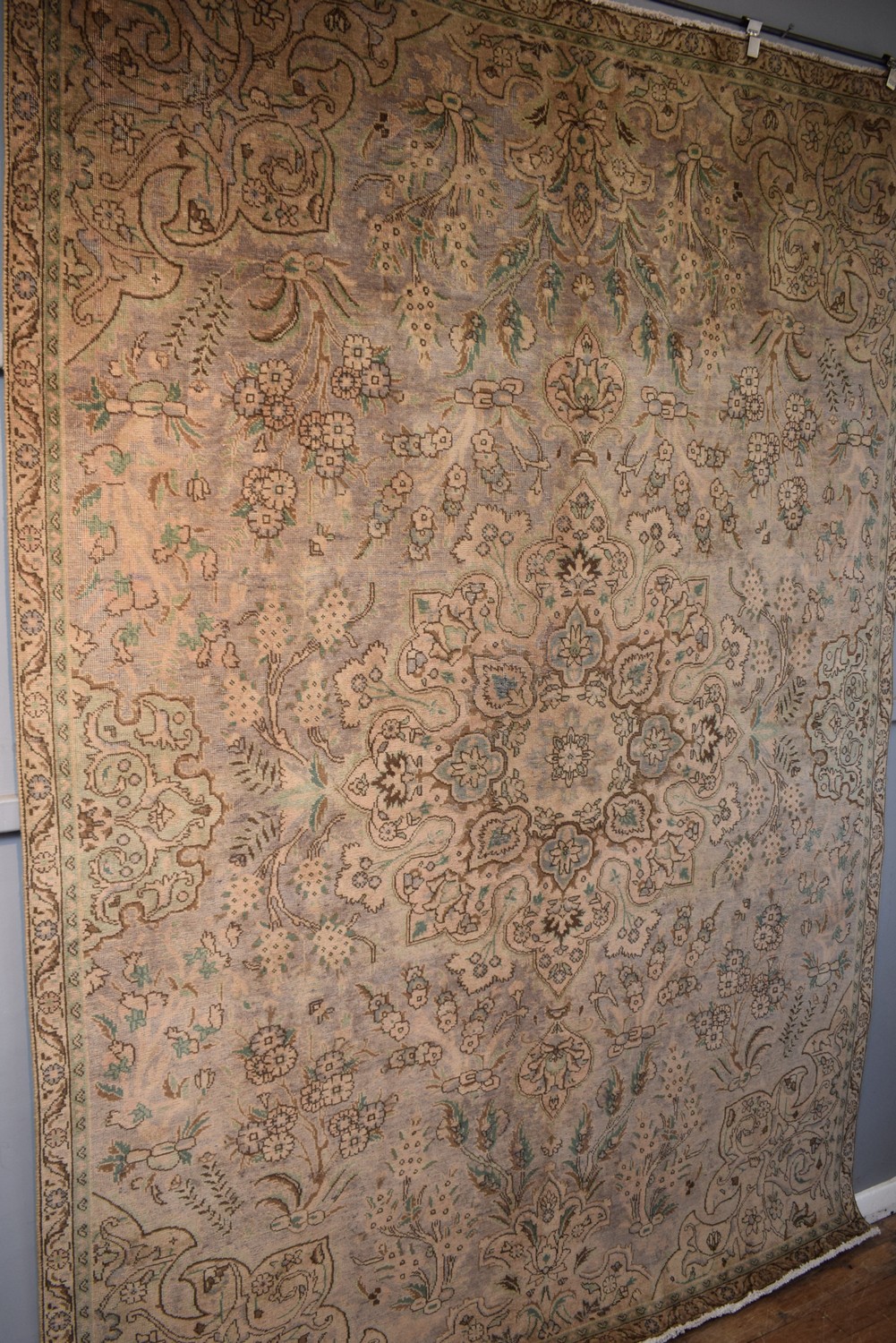 AN ATTRACTIVE VINTAGE OVER-DYED PERSIAN TABRIZ CARPET, VINTAGE PILE. A UNIQUE MODERN CARPET CREATED FROM AN AUTHENTIC VINTAGE ALL-OVER DESIGN TABRIZ CARPET WITH THE PILE SHORN AND OVER-DYED IN LAVENDER, BEIGE & BLUE TONES. GALLERY EXHIBITED. CERTIFICATE OF AUTHENTICITY INCLUDED. SIZE: 314X228CM ORIGIN: PERSIA - RRP: $5,900