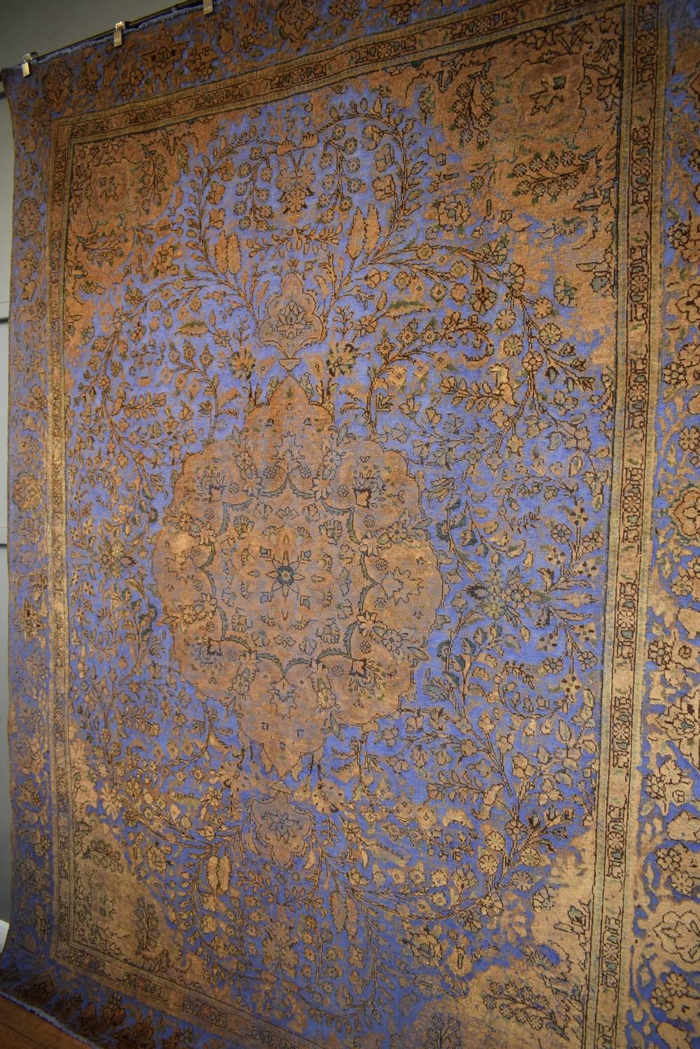 A SUPERB CONTEMPORARY VINTAGE OVER-DYED PERSIAN TABRIZ CARPET, VINTAGE PILE. A UNIQUE MODERN CARPET CREATED FROM AN AUTHENTIC VINTAGE MEDALLION DESIGN TABRIZ CARPET WITH THE PILE SHORN AND OVER-DYED IN A BEAUTIFUL VIOLET BLUE, LIGHT GREEN AND TAN TONES. GALLERY EXHIBITED. CERTIFICATE OF AUTHENTICITY INCLUDED. SIZE: 324X235CM ORIGIN: PERSIA - RRP: $6,900