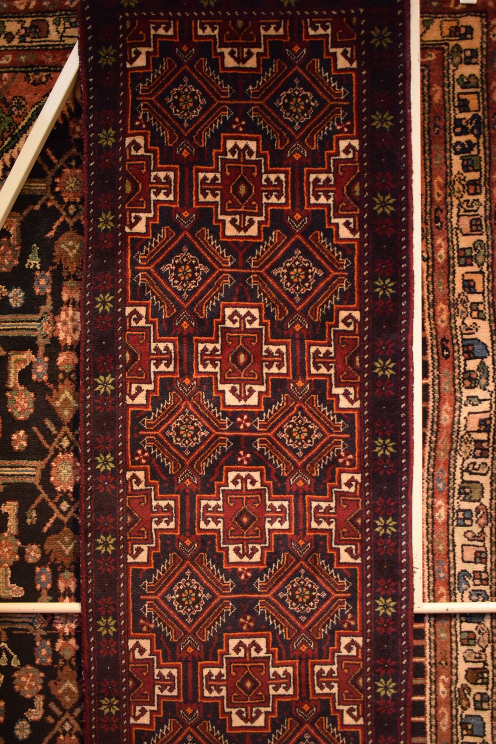 A FINELY-HAND-KNOTTED TRIBAL BALOUCH HALL RUNNER. 100% WOOL. DENSE AND STUDY PILE. TRIBAL WEAVE FROM THE KHORASAN PROVINCE WITH DESIGN OF REPEATING TRIBAL MEDALLIONS IN A DEEP RED TONED FIELD OF TRIBAL PATTERNS. WITH A BORDER OF ROSETTES. EX-GALLERY INVENTORY. NEW & IN EXCELLENT CONDITION. CERTIFICATE OF AUTHENTICITY INCLUDED. SIZE: 170X63CM ORIGIN: PERSIA - RRP: $990